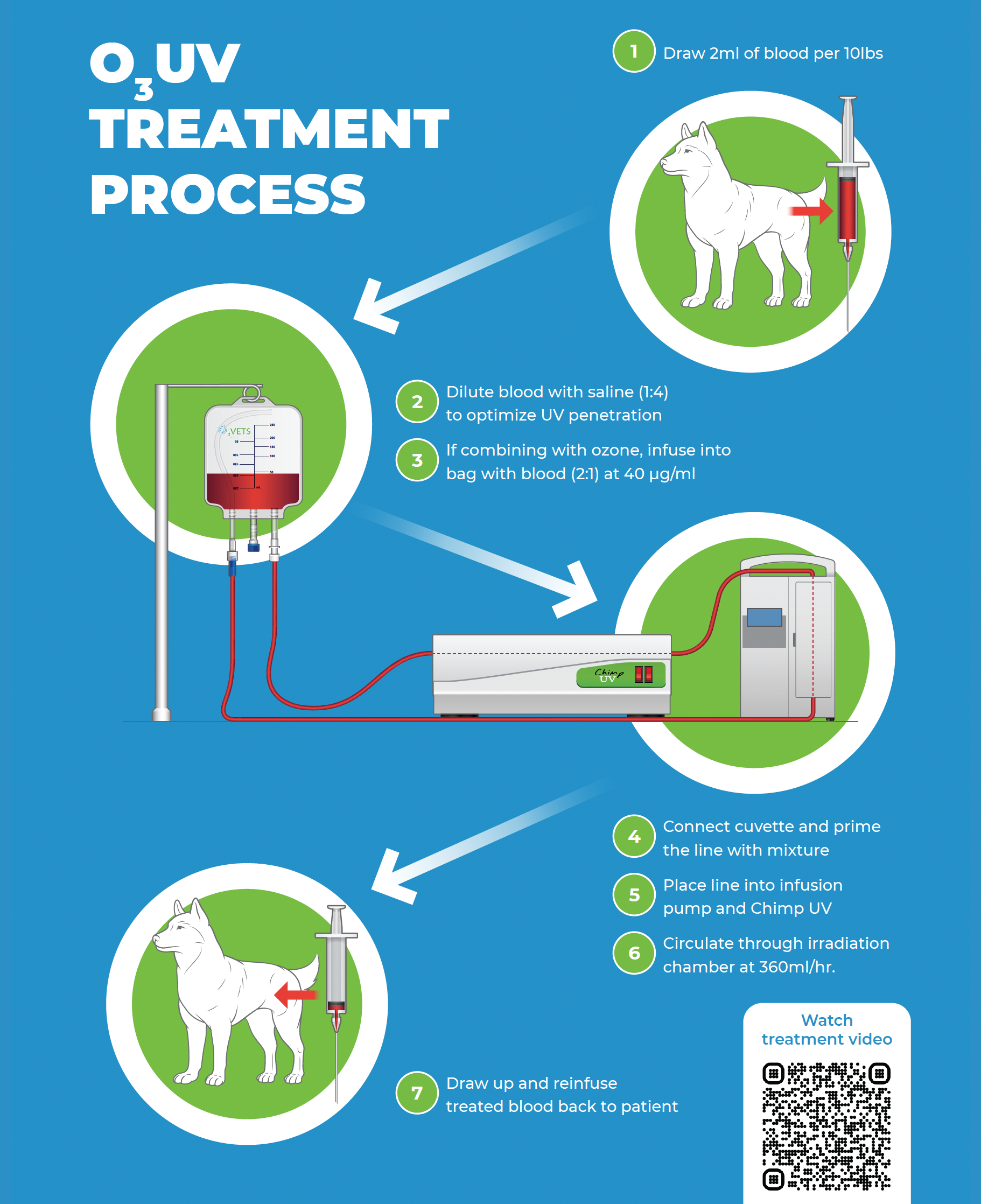 O3UV consists of withdrawing blood, diluting it with saline (4:1), infusing ozone gas into that blood/saline mixture and then exposing it to ultraviolet light in our Chimp UV machine.