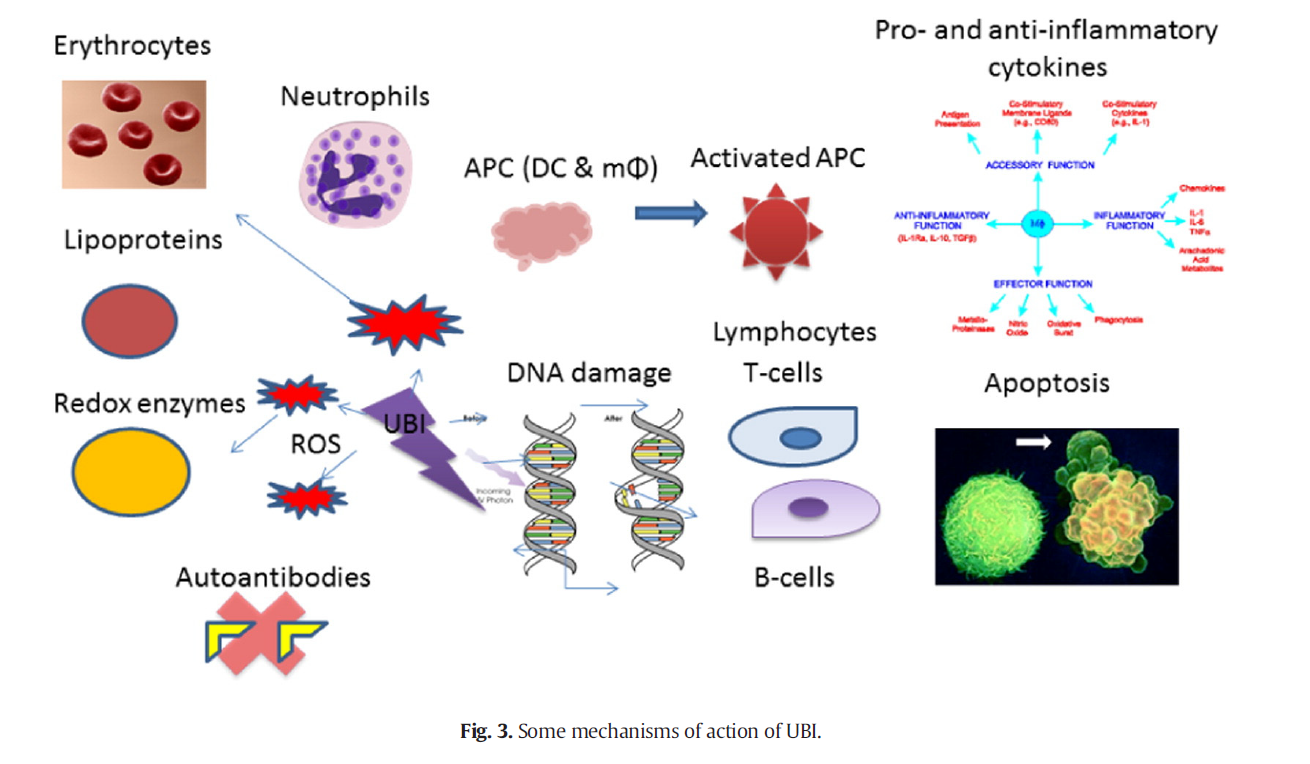 I was able to work directly with Michael Hamblin, PhD on a project that he undertook for us to summarize the mechanism of action of UBI in which he noted that, "Stimulation of phagocytic activity appears to be one of the earliest mechanisms in immuno-correction by UV-irradiation of blood therapy." Further on in his summary, he noted that, "...T–lymphocytes were exquisitely hypersensitive to the DNA-damaging and lethal effects of UV-B radiation, raising the possibility that UV-B may make a contribution to immunosuppression via a direct effect on xtracapilliary T- lymphocytes.