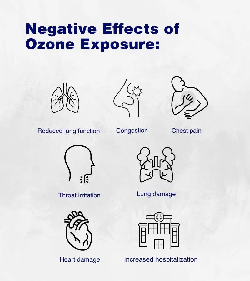 “When inhaled, ozone can damage the lungs. Relatively low amounts can cause chest pain, coughing, shortness of breath, and throat irritation. Ozone may also worsen chronic respiratory diseases such as asthma and compromise the ability of the body to fight respiratory infections. People vary widely in their susceptibility to ozone.”